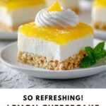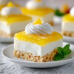 These No-Bake Lemon Cheesecake Bars are a refreshing and tangy dessert featuring a buttery graham cracker crust, smooth lemon-infused cream cheese filling, and a luscious lemon topping. Perfectly chilled and garnished with whipped cream and lemon slices, they offer a bright citrus flavor without the need for baking.