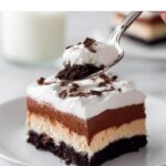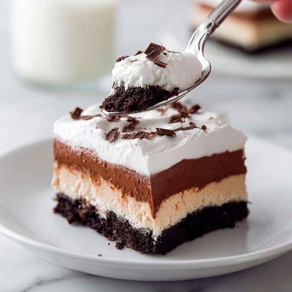 Whisk together the milk and the instant chocolate pudding mix according to package instructions until it thickens nicely. Once set, spread the pudding smoothly over the peanut butter filling. This chocolate layer adds a lovely contrast, producing a rich, chocolatey complement to the nutty middle layer.