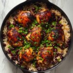 6. Cook the Chicken with Rice: Nestle the seared chicken thighs back into the pan on top of the rice, skin side up. Cover with a lid and reduce heat to low. Simmer gently for 25–30 minutes, or until the rice is tender and the chicken is cooked through with an internal temperature of 165°F (74°C).