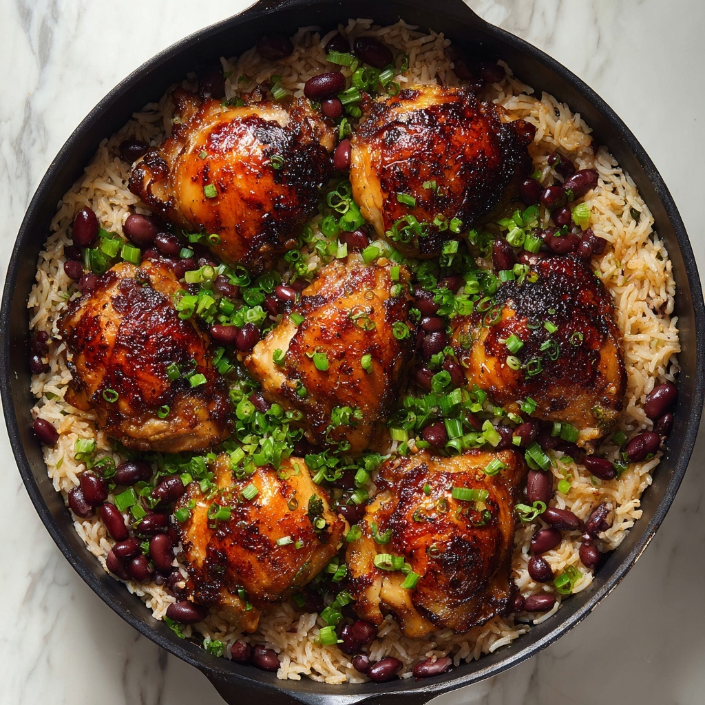This One-Pot Jerk Chicken with Rice & Peas is a vibrant and flavorful Caribbean-inspired meal featuring tender, spicy jerk chicken thighs cooked atop perfectly seasoned rice and kidney beans in creamy coconut milk. This comforting and easy-to-make dish combines aromatic spices, fresh herbs, and a touch of heat in a single skillet, making it an ideal weeknight dinner or meal prep option.