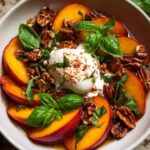 A fresh and vibrant Peach & Burrata Caprese salad featuring sweet peaches, creamy burrata cheese, spicy hot honey, and crunchy candied pecans, perfectly balanced with basil, lemon, and olive oil. This recipe combines sweet, spicy, and savory elements for a delightful appetizer or light meal.