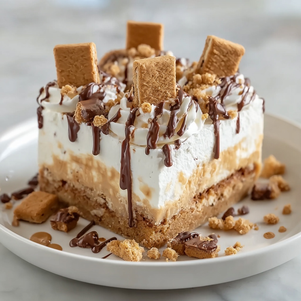 Gently spread the remaining 2 cups of whipped topping over the peanut butter layer. Then sprinkle with peanut butter chips and the chopped reserved cookies. For that extra touch of peanut butter magic, drizzle melted creamy peanut butter across the top for a glossy, delectable finish.