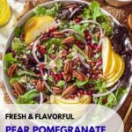 A fresh and vibrant Pear Pomegranate Salad combining crisp mixed baby greens with the sweetness of ripe pears, tangy pomegranate arils, crunchy glazed pecans, and creamy crumbled feta, all dressed in a flavorful Maple Dijon Vinaigrette. Perfect as a light appetizer or side dish, this salad is quick to assemble and packed with contrasting textures and flavors.