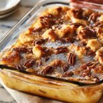 This Pecan Pie Bread Pudding is a decadent dessert combining the comforting textures of bread pudding with the rich flavors of pecan pie. Day-old French bread or brioche is soaked in a spiced custard, topped with a buttery pecan mixture, and baked to golden perfection. An optional homemade caramel sauce elevates this classic Southern-inspired treat, making it perfect for holiday gatherings or cozy weekends.