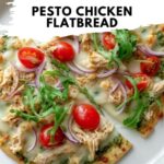 This Pesto Chicken Flatbread is a quick and delicious meal perfect for casual lunches or easy dinners. Featuring crispy flatbread topped with flavorful basil pesto, tender cooked chicken, gooey mozzarella and Parmesan cheeses, and fresh vegetables, this recipe combines vibrant Mediterranean flavors in just 30 minutes. It’s oven-baked to golden perfection and garnished with fresh arugula and basil for a fresh finish.