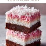 If you want to keep these bars longer, freeze them without the coconut topping for best texture. Wrap individual pieces in plastic wrap and place them in a freezer-safe container. They can last up to 2 months frozen. Thaw in the fridge before adding the pink coconut topping and whipped cream.