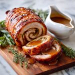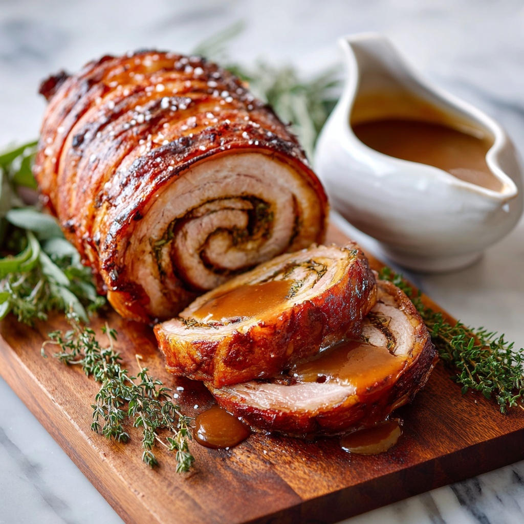 Present your porchetta as a centerpiece on a wooden carving board, ribbons of crackled skin glistening under soft lighting. You can also serve it sliced thinly in rustic sandwiches with arugula and mustard mayo for a fabulous casual lunch. Another fun idea is to dice leftovers and toss them into a vibrant pasta or grain bowl with roasted veggies and a drizzle of your pan gravy for an easy next-day meal.