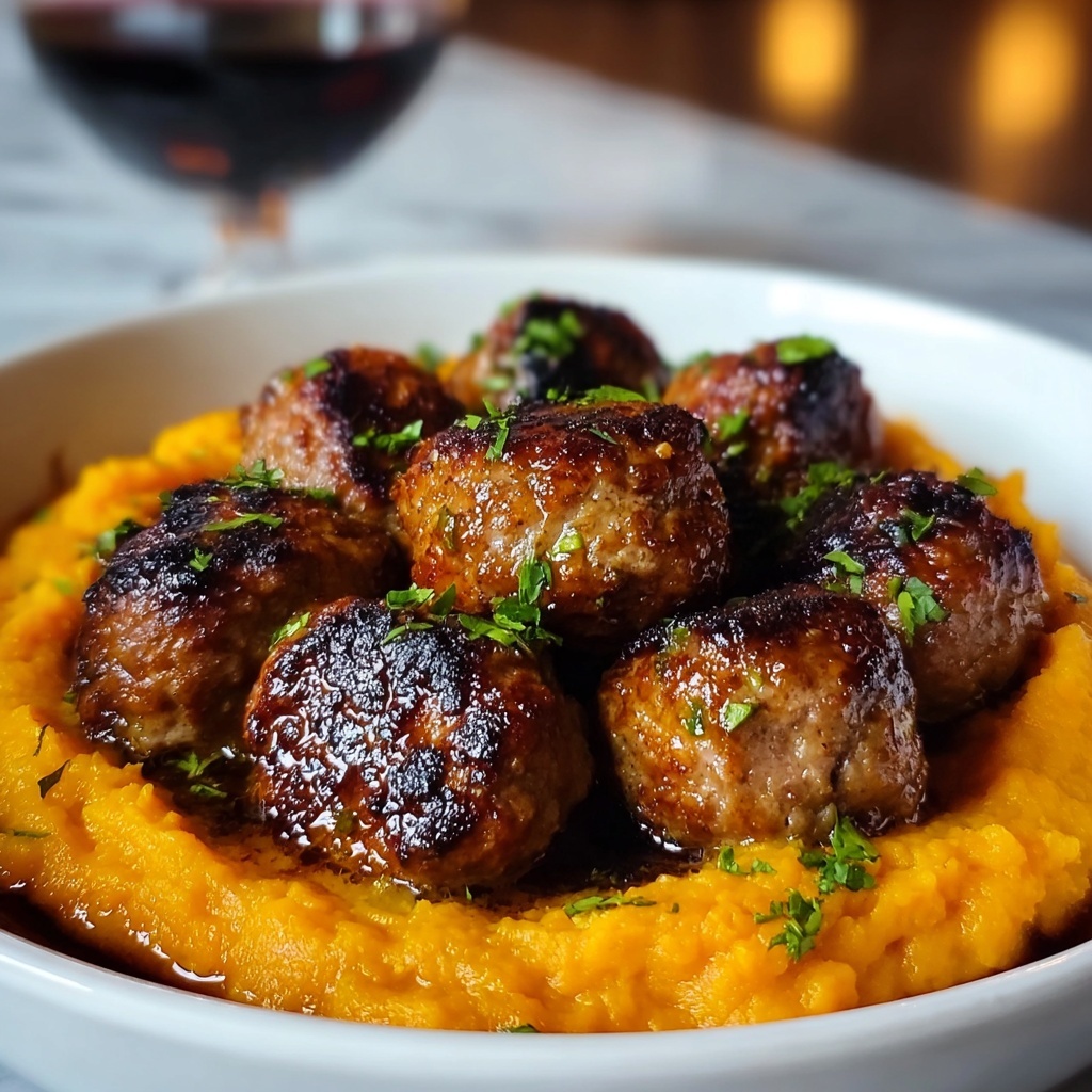 These Pork Meatballs with Sweet Potato Mash combine savory seasoned meatballs cooked in a rich bourbon-maple sauce with creamy, spiced sweet potatoes. Perfect for a comforting yet flavorful meal, this recipe balances the smoky, sweet, and hearty elements beautifully in under an hour.