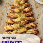 Serve the puff pastry Christmas tree on a rustic wooden board or a festive platter decorated with extra sprigs of herbs and cherry tomatoes to mimic ornaments. For a bit of sparkle, use edible gold dust on the pastry’s tips, or place small cubes of colorful cheese around it for a fun presentation that invites everyone to dig in.