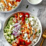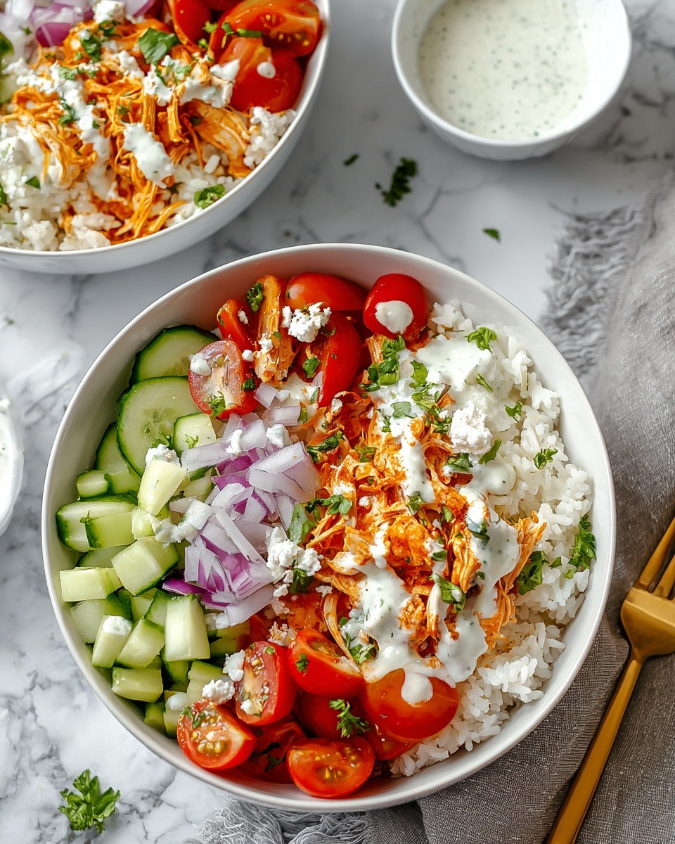 - Add Toppings: Sprinkle shredded cheddar cheese (if using), cherry tomatoes, diced cucumber, finely chopped red onion, and crumbled blue cheese or feta evenly over the buffalo chicken in the bowls.