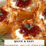 This Quick Pepper Jelly Cream Cheese Appetizer features crispy mini phyllo shells filled with smooth cream cheese and topped with sweet and spicy red pepper jelly. Garnished with fresh thyme or green onion, it makes a simple yet elegant bite-size appetizer perfect for parties and gatherings.