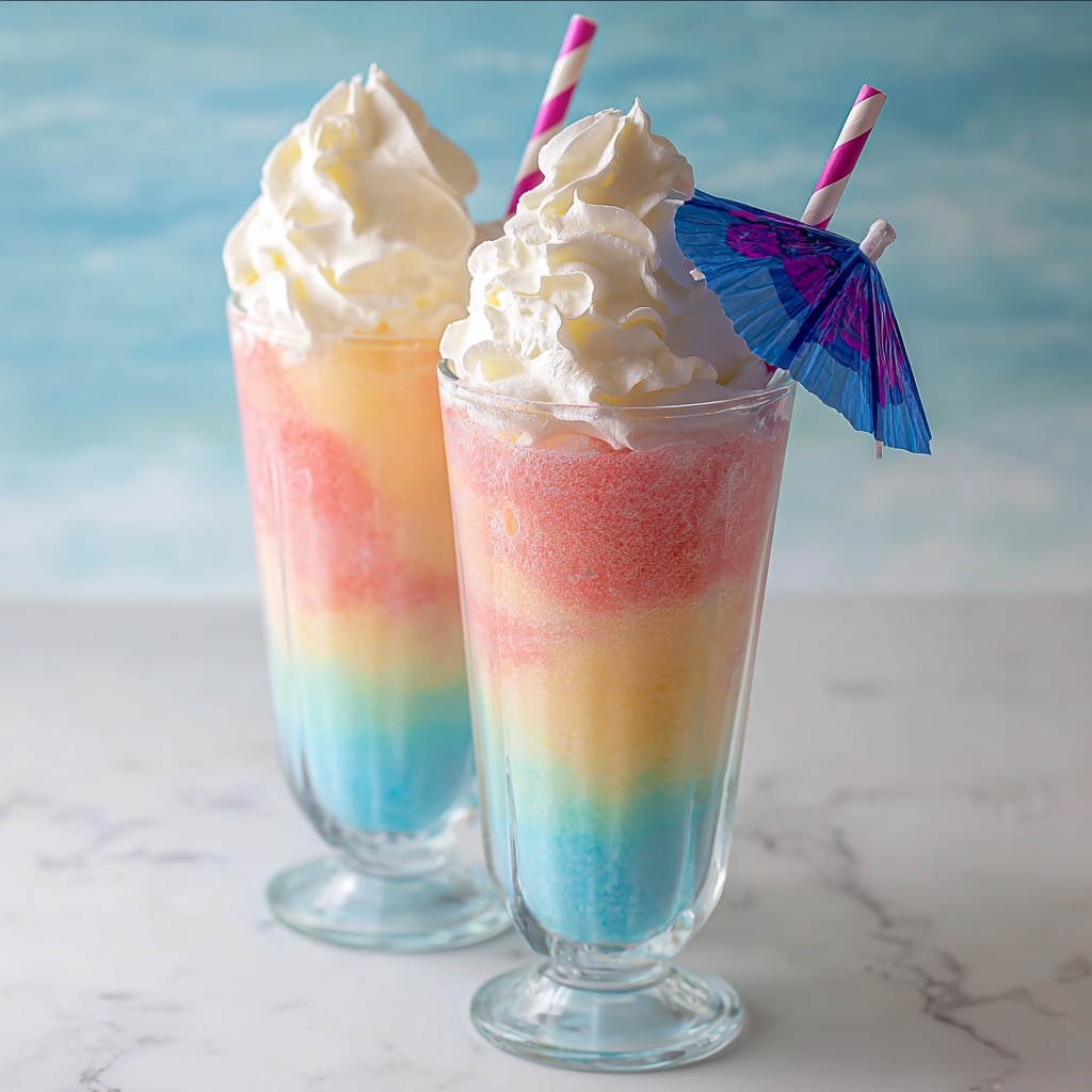 Hosting a party? Serve your Rainbow Island Floats in clear glass mugs or fun tiki glasses to really show off those mesmerizing syrup layers. Add colorful straws and tiny paper umbrellas for that beach-bar aesthetic. For an extra festive touch, rim the glasses with colored sugar crystals or dip the rims in melted white chocolate and sprinkle with crushed freeze-dried fruit.