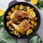 For a rustic family-style dinner, serve the skillet straight from the oven, letting everyone dig in while it’s piping hot. Alternatively, dress up the dish by plating each chicken leg quarter atop a nest of the roasted potatoes and shallots, garnished with parsley and lemon wedges artfully arranged on the side. For a festive touch, sprinkle some toasted pine nuts over the potatoes or add a few sprigs of fresh thyme or rosemary on top for an aromatic flourish that impresses guests.