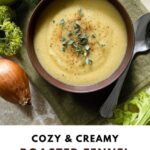 Serve this soup in rustic bowls for a cozy, home-style vibe or go modern with clear glass cups to showcase the soup’s inviting pale green hue. For a party or appetizer, offer the soup in mini cups garnished with microgreens or fennel tips for a charming and elegant touch.