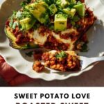 Now the fun part! Stack the halves of sweet potato, spreading a bit of chipotle sauce on top, then pile on the seasoned chicken. Spoon more sauce over the chicken, and add your toppings—avocado, cilantro, pickled onions, and crunchy heat from chili crisp or pistachios. The layers here create a gorgeous tower that tastes even better than it looks.
