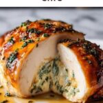 A delicious copycat recipe of Ruth’s Chris Stuffed Chicken, featuring tender chicken breasts stuffed with a creamy blend of cream cheese, spinach, and mozzarella, seared to golden perfection and baked with a savory broth and lemon juice, then finished with a touch of Parmesan cheese.