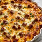 A hearty and comforting Sausage, Egg, and Cream Cheese Hashbrown Casserole featuring savory breakfast sausage, creamy cheese blend, eggs, and crispy hashbrowns baked to golden perfection. This dish is perfect for a satisfying breakfast or brunch that serves up to 8 guests.
