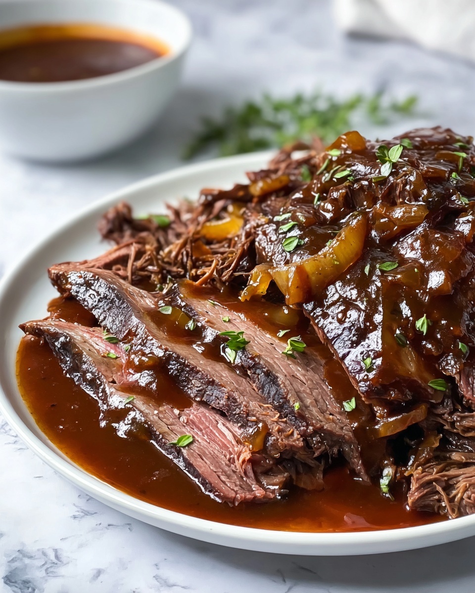 - Rest & Serve: Once cooked, let the brisket rest for 15–20 minutes to allow juices to redistribute. Slice the meat against the grain for tenderness, spoon the sauce from the slow cooker over the slices, and serve hot.