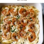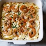 6. Assemble in Baking Dish: Transfer the coated pasta into a large baking dish, spreading it evenly. Arrange the sautéed shrimp on top for an attractive presentation.