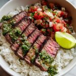 Slice the rested steak thinly against the grain to maximize tenderness. Then, divide the cooked rice evenly among four bowls. Top each bowl with the steak slices, followed by creamy avocado, halved cherry tomatoes, and a sprinkle of queso fresco if you’re using it. Generously drizzle your homemade chimichurri sauce on top and finish with a lime wedge on the side.