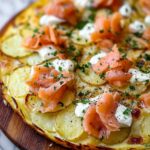 This Smoked Salmon Potato Pizza combines a crispy golden crust with thinly sliced, seasoned potatoes, a creamy dill sauce, and flavorful smoked salmon topped with fresh herbs and a hint of lemon. Perfect as a sophisticated appetizer or light meal, this pizza offers a delightful blend of textures and flavors.