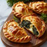 These Spiced Spinach & Potato Pasty Pies are savory hand pies filled with a flavorful mixture of spiced potatoes, wilted spinach, and aromatic Indian-inspired spices. Enveloped in flaky pie crust and baked to golden perfection, they make a delightful snack or main course that’s vegetarian-friendly and perfect for warm or room temperature serving.