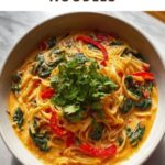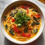 Serve your spicy coconut noodles hot, topped generously with fresh cilantro. These finishing herbs add a refreshing aromatic lift that makes every bite sing with flavor.