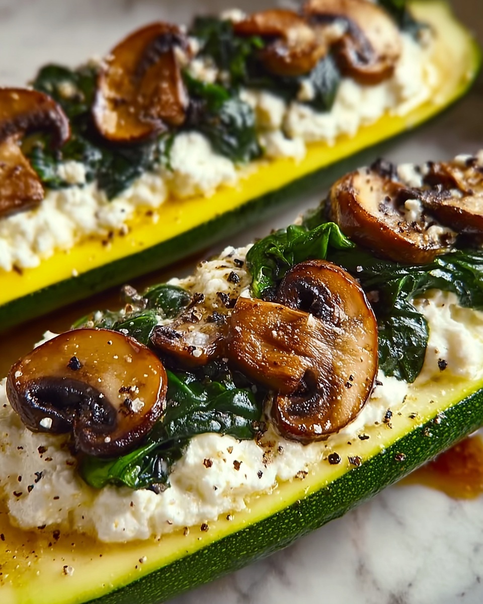 Delicious and nutritious Spinach, Mushroom, and Ricotta Stuffed Zucchini boats baked to perfection with a cheesy, flavorful filling, making a perfect vegetarian main or side dish.