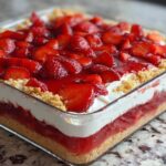 Next, sprinkle the dry yellow cake mix evenly over the cream cheese and strawberry layers. The dry mix might look scattered but that’s perfect—it will soak up the buttery goodness and soften as it bakes. Finally, drizzle the melted butter over the entire surface, making sure to cover as much as possible to achieve a golden, crisp topping.