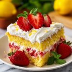 Spread the luscious lemon pudding topping evenly over the chilled cake. If you’re feeling fancy, finish with fresh whole or sliced strawberries to add a burst of natural sweetness and visual appeal. Keep the poke cake refrigerated until it’s time to serve, ensuring each slice is cool, refreshing, and bursting with flavor.