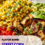 This vibrant Street Corn Chicken Rice Bowl combines tender, spiced chicken with sweet corn, fresh bell peppers, and creamy avocado, all served over a bed of fluffy rice. Enhanced with zesty lime juice and fresh cilantro, it’s a flavorful and wholesome meal perfect for a quick lunch or dinner.