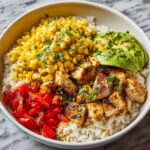 This vibrant Street Corn Chicken Rice Bowl combines tender, spiced chicken with sweet corn, fresh bell peppers, and creamy avocado, all served over a bed of fluffy rice. Enhanced with zesty lime juice and fresh cilantro, it’s a flavorful and wholesome meal perfect for a quick lunch or dinner.