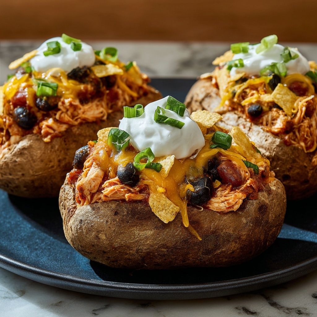 Once the potatoes are out of the oven and slightly cooled, slice down the center of each. Use a fork to fluff the potato interiors, making space for the taco filling. Spoon the seasoned chicken or chickpea mixture generously inside each potato. Top with shredded cheese while the potatoes are still warm, allowing it to melt luxuriously over the filling. Follow with salsa, sour cream, diced avocado, and fresh cilantro for layers of vibrant flavor and texture. For an extra burst of heat or color, add sliced jalapeños or green onions.