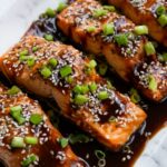 This Teriyaki Salmon recipe features tender salmon fillets marinated in a flavorful homemade teriyaki sauce made from soy sauce, hoisin sauce, brown sugar, garlic, and ginger. The salmon is baked to perfection in the oven and finished with a rich, thickened teriyaki glaze, garnished with sesame seeds and chopped green onions, making it an easy yet impressive main dish perfect for a weeknight dinner or entertaining guests.