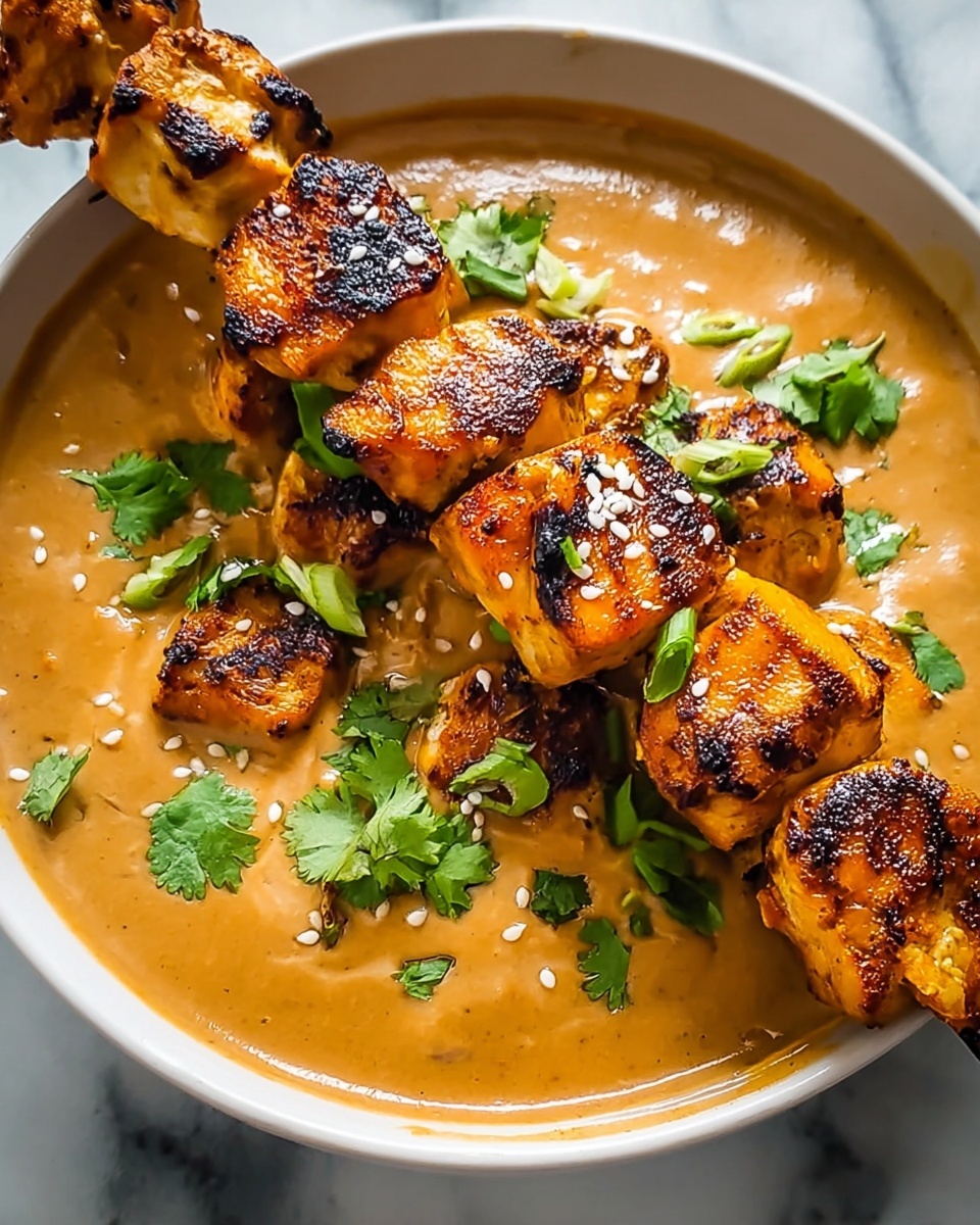 Fresh garnishes bring this dish to life visually and add an extra layer of flavor. Sprinkling chopped fresh cilantro over the chicken skewers adds a refreshing herbal note that complements the rich peanut sauce. A wedge of lime on the side encourages guests to add a citrusy burst, balancing the dish beautifully.