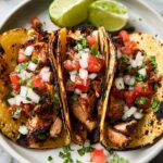 This easy and flavorful grilled chicken tacos recipe features tender marinated chicken breasts grilled to perfection, served with warm tortillas and fresh toppings like salsa, guacamole, shredded lettuce, diced tomatoes, and cheese. Perfect for a quick and satisfying Mexican-inspired meal that serves 4.