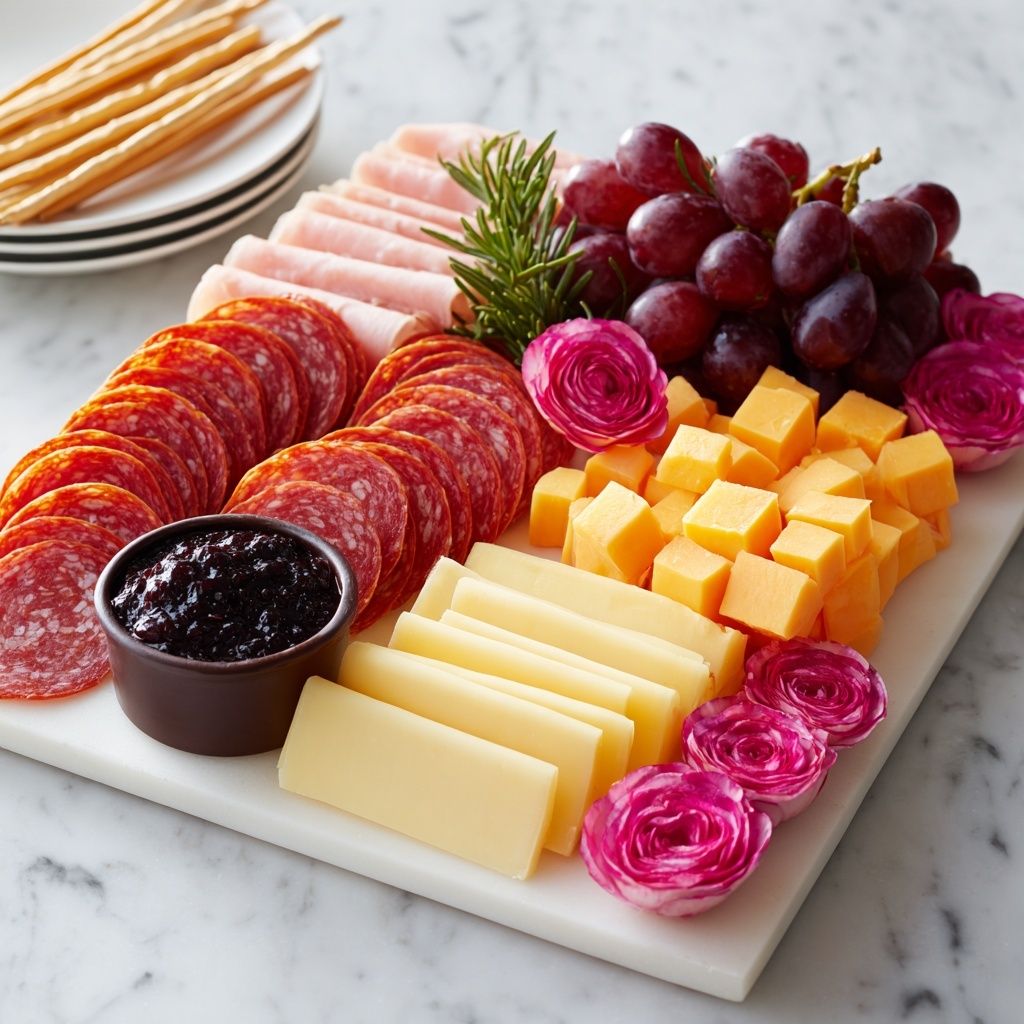 Scatter fresh red grapes and jewel-like pomegranate seeds between the meat and cheese clusters for juicy bursts of sweetness. Sprinkle dried cranberries in smaller pockets for unexpected tart pops. Place roasted red peppers in small mounds and include a small bowl of red onion jam near your cheese selections to add savory-sweet depth and richness.