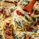 This Tuscan Chicken and Spaghetti Squash recipe offers a flavorful, low-carb twist on classic pasta dishes by swapping traditional pasta with nutrient-packed spaghetti squash. Tender chicken is cooked with fragrant garlic, shallots, and sun-dried tomatoes in a creamy Parmesan sauce, complemented by fresh baby spinach and herbs for a comforting, wholesome meal.