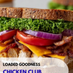 The Ultimate Loaded Chicken Club is a delicious, hearty sandwich packed with grilled chicken breast, crispy bacon, cheddar cheese, fresh tomato, and romaine lettuce, all held together by toasted whole grain bread and creamy mayonnaise. Perfect for a quick and flavorful meal that combines protein and fresh veggies in every bite.