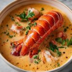 This velvety lobster bisque is a rich and creamy seafood soup made from succulent lobster tails, aromatic vegetables, and a flavorful seafood stock. Enhanced with brandy, tomato paste, and seasoned with paprika and thyme, it offers the perfect elegant starter or main dish for seafood lovers.