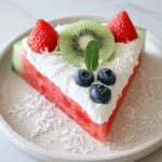 Finally, sprinkle shredded coconut over the entire watermelon pizza and garnish with fresh mint leaves. The mint adds a cool contrast while the coconut brings a nice textural pop. Once garnished, your Watermelon Fruit Pizza Recipe is ready to be served immediately for the best fresh experience.