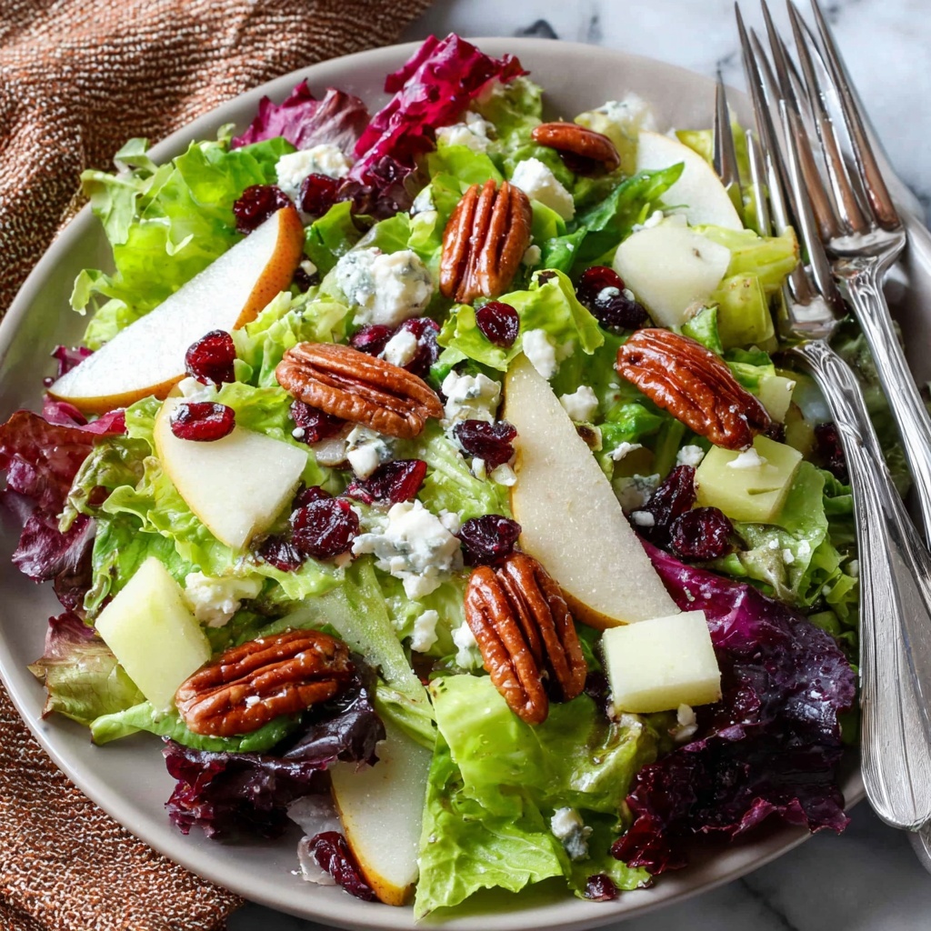 A refreshing and vibrant winter salad combining mixed greens, sweet pears, crunchy pecans, and tangy dried cranberries, all dressed in a zesty white wine vinaigrette and topped with creamy crumbled blue cheese. Perfect as a light meal or a festive side dish.